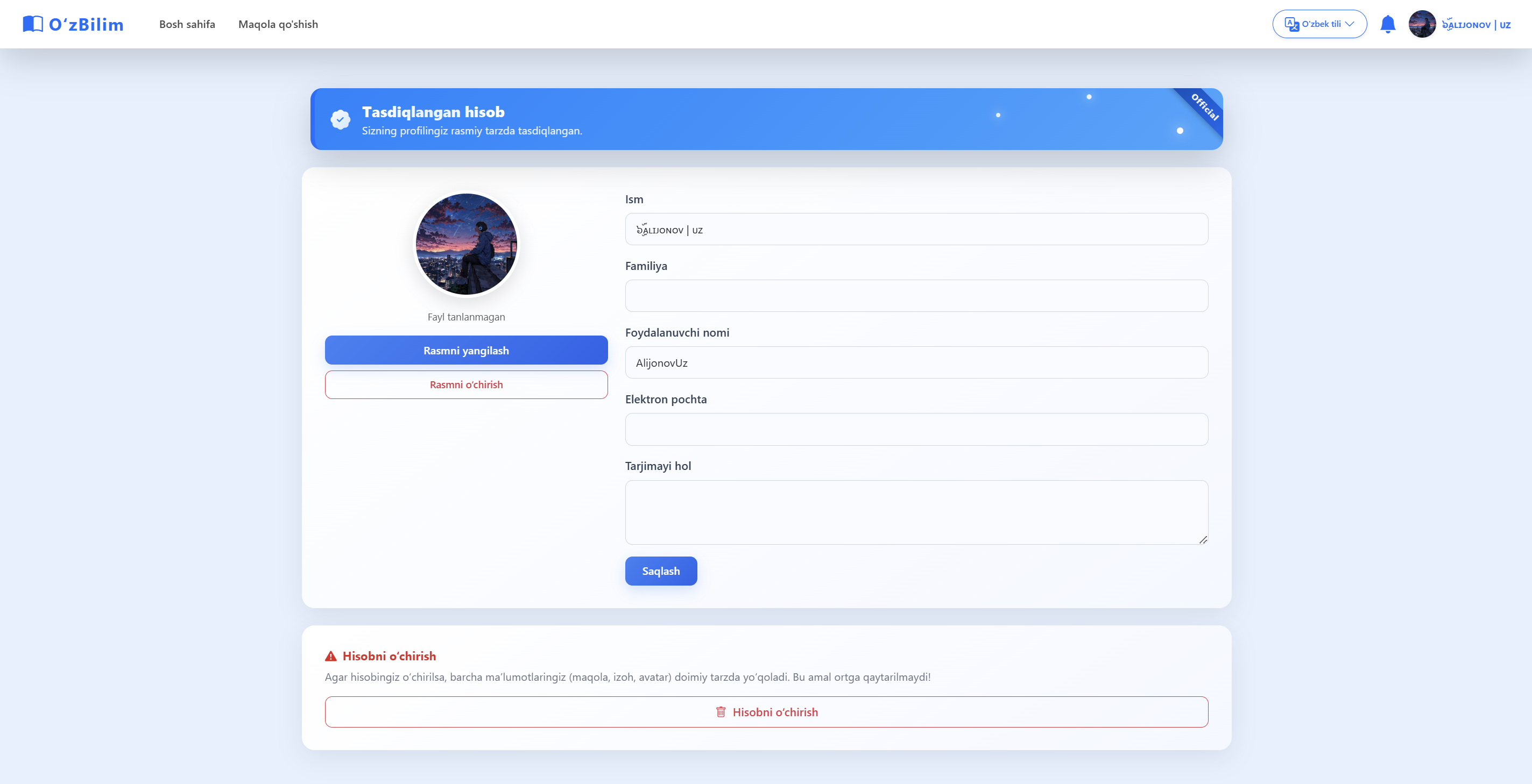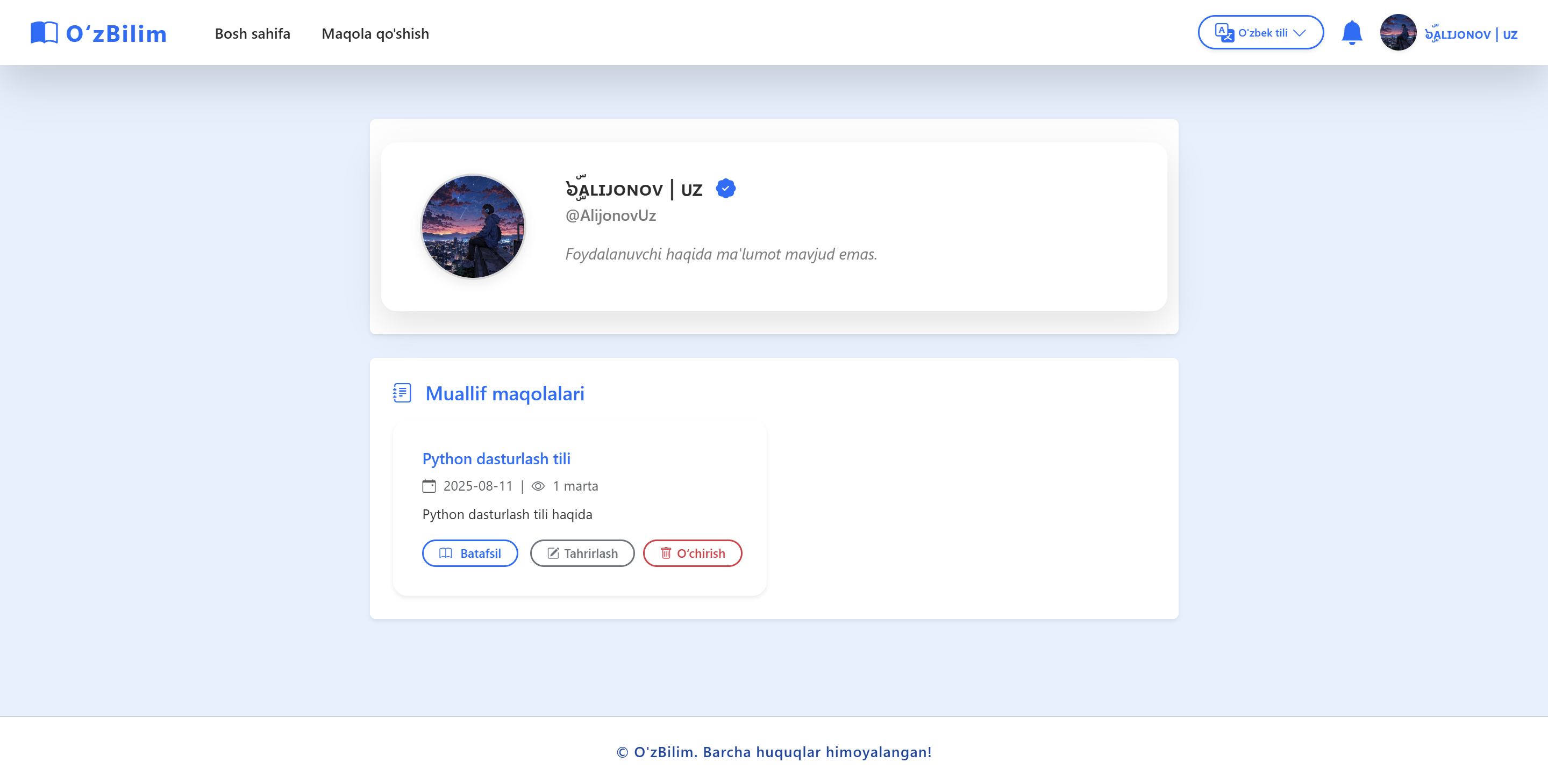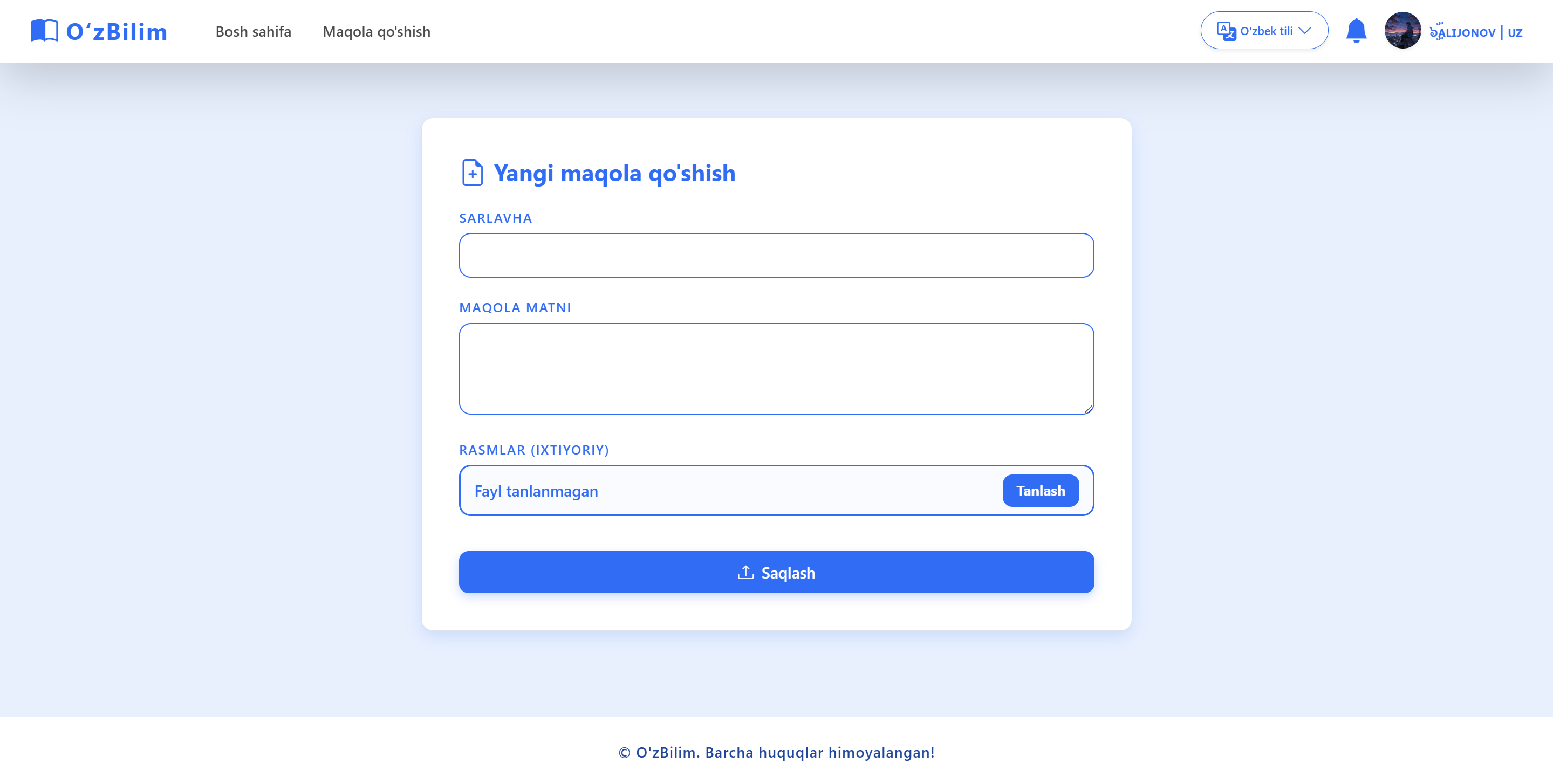 O‘zBilim — foydalanuvchilar yaratadigan va tahrirlaydigan bilimlar bazasi va blog platformasi. Unda ma’lumotlarni izlash, o‘qish, yangi maqolalar qo‘shish va mavjudlarini tahrirlash mumkin. Loyiha o‘zbek tilidagi bilimlar zaxirasini kengaytirish va foydalanuvchilarni hamkorlikka undash uchun mo‘ljallangan.