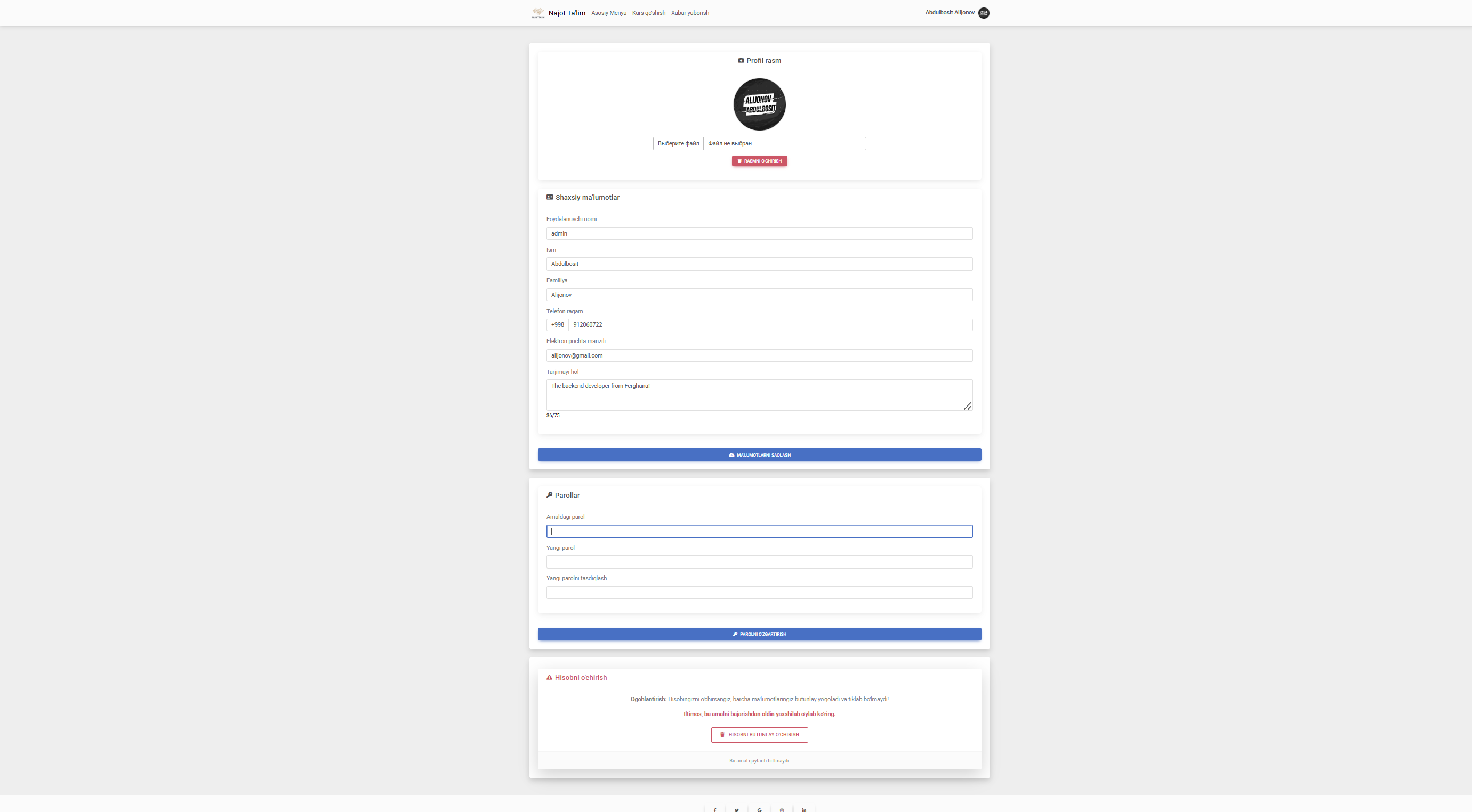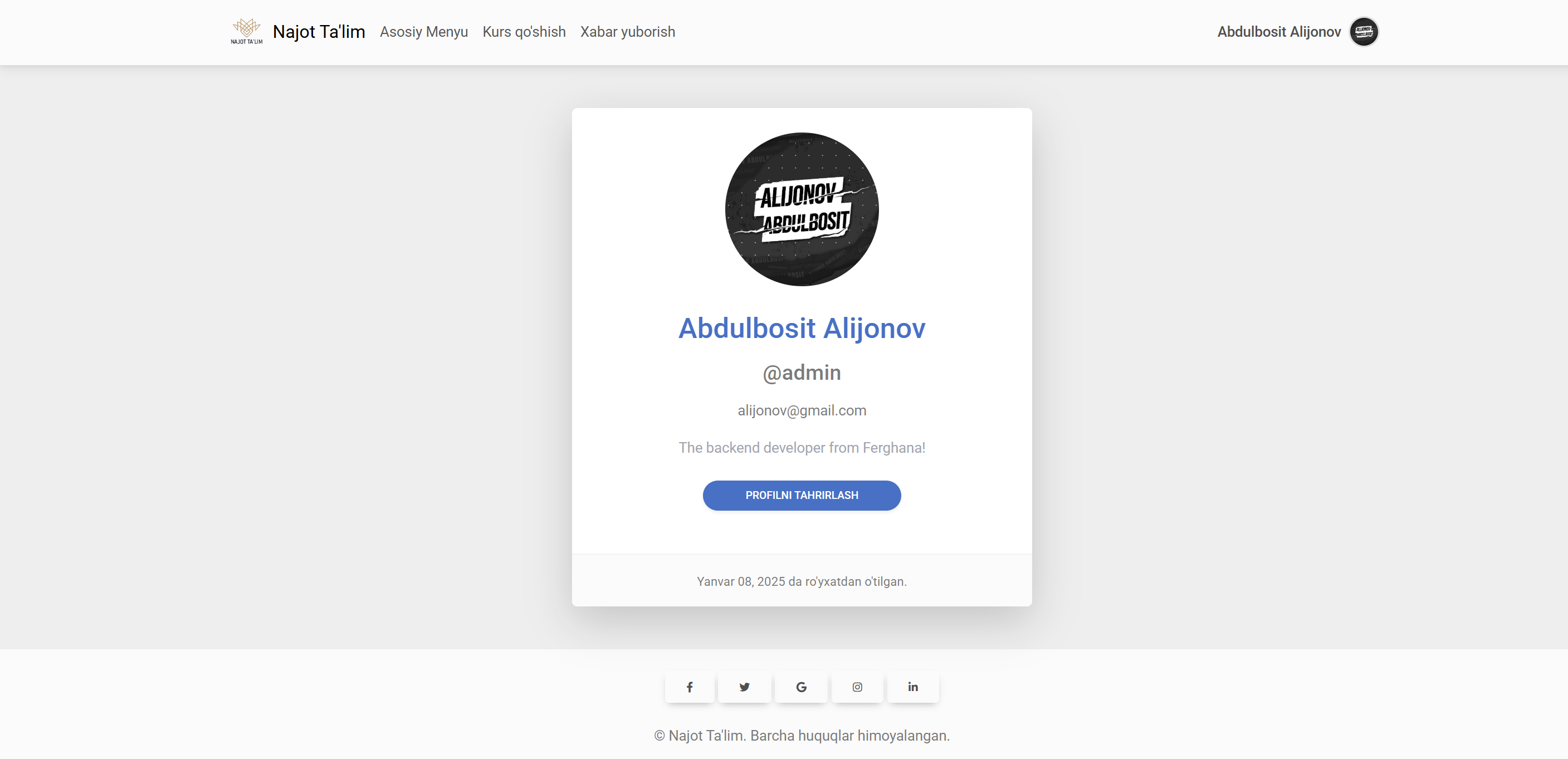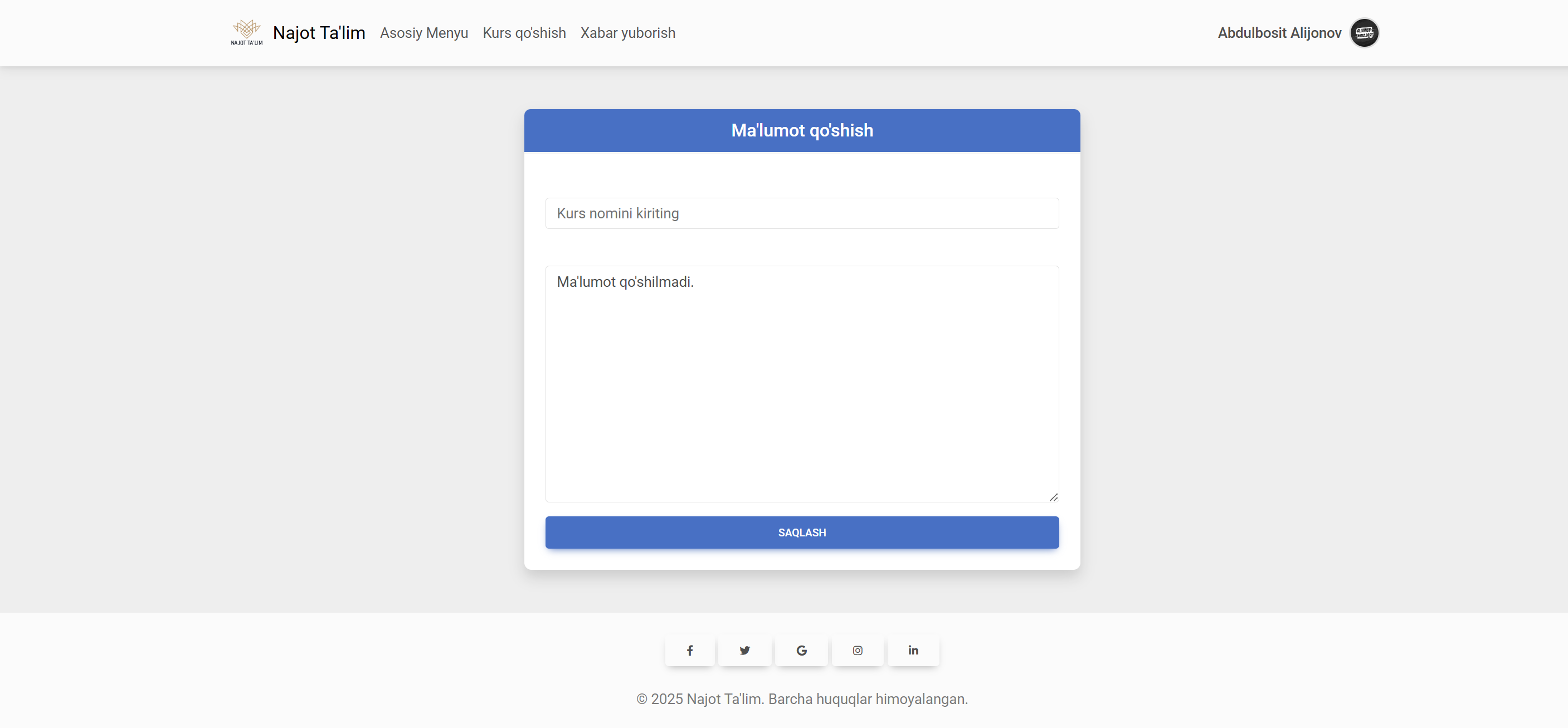 School Management System — kurslar va ularga biriktirilgan foydalanuvchilarni boshqarish uchun mo‘ljallangan tizim. Adminlar yangi kurslar qo‘shishi, tahrirlashi yoki o‘chirishi mumkin. Shuningdek, ular kerakli foydalanuvchilarni kurslarga biriktirib, ularning ishtirokini boshqaradi. Loyiha ta’lim jarayonini markazlashgan holda boshqarishni osonlashtirish uchun ishlab chiqilgan.